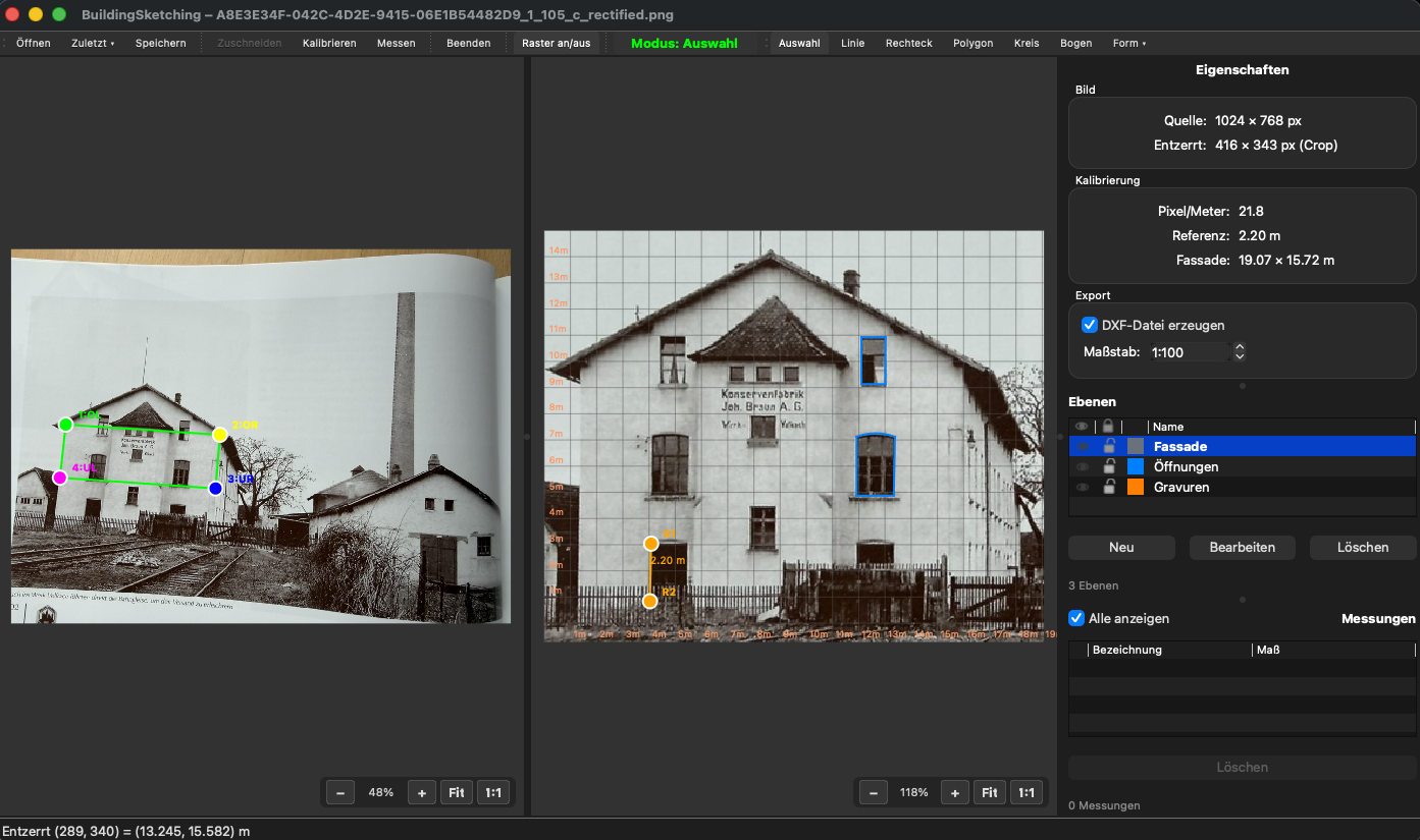 BuildingSketcher korrigiert die Perspektive Deiner Gebäudefotos und erstellt präzise, kalibrierte Zeichnungen für CAD, Modellbau und Dokumentation.